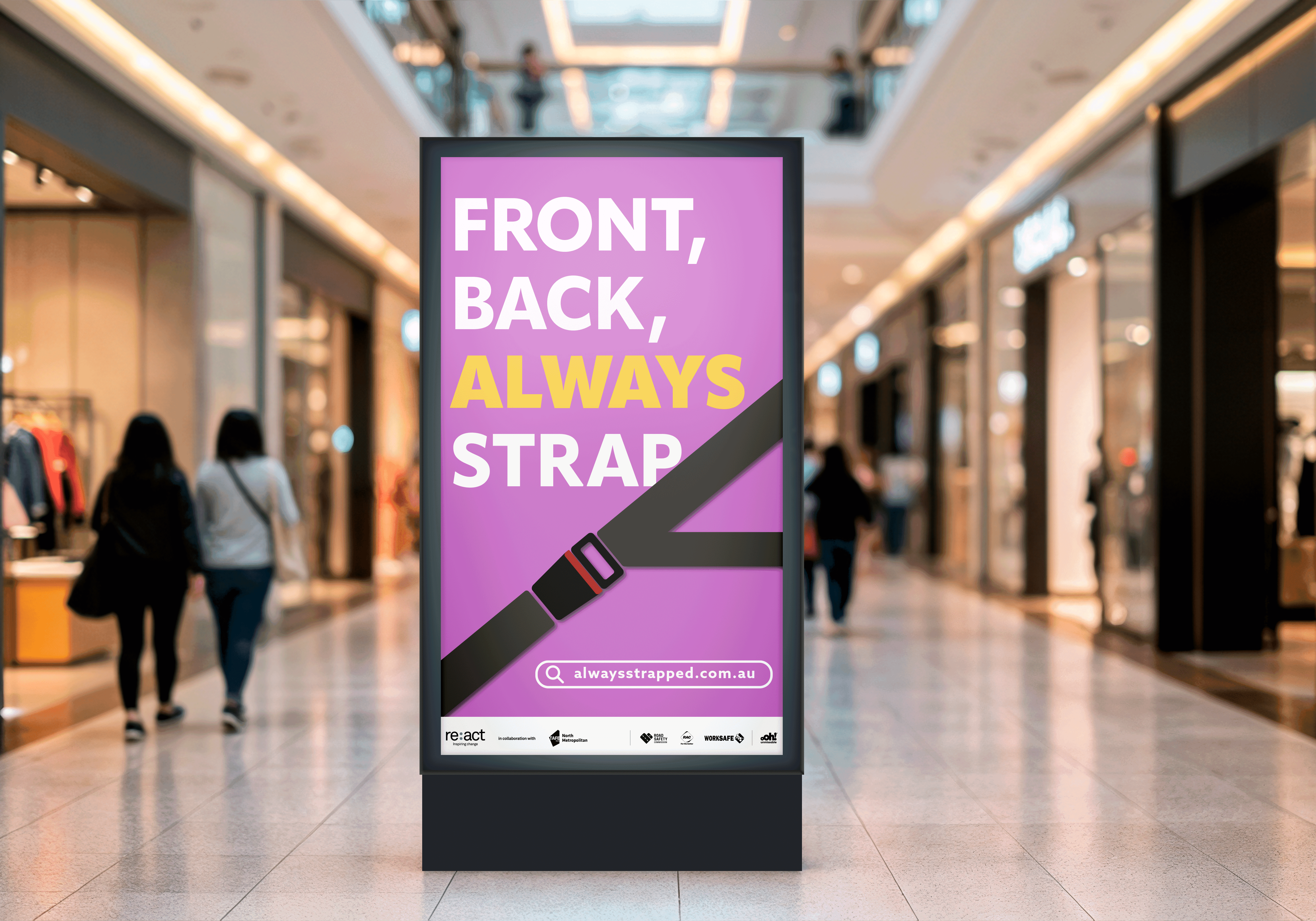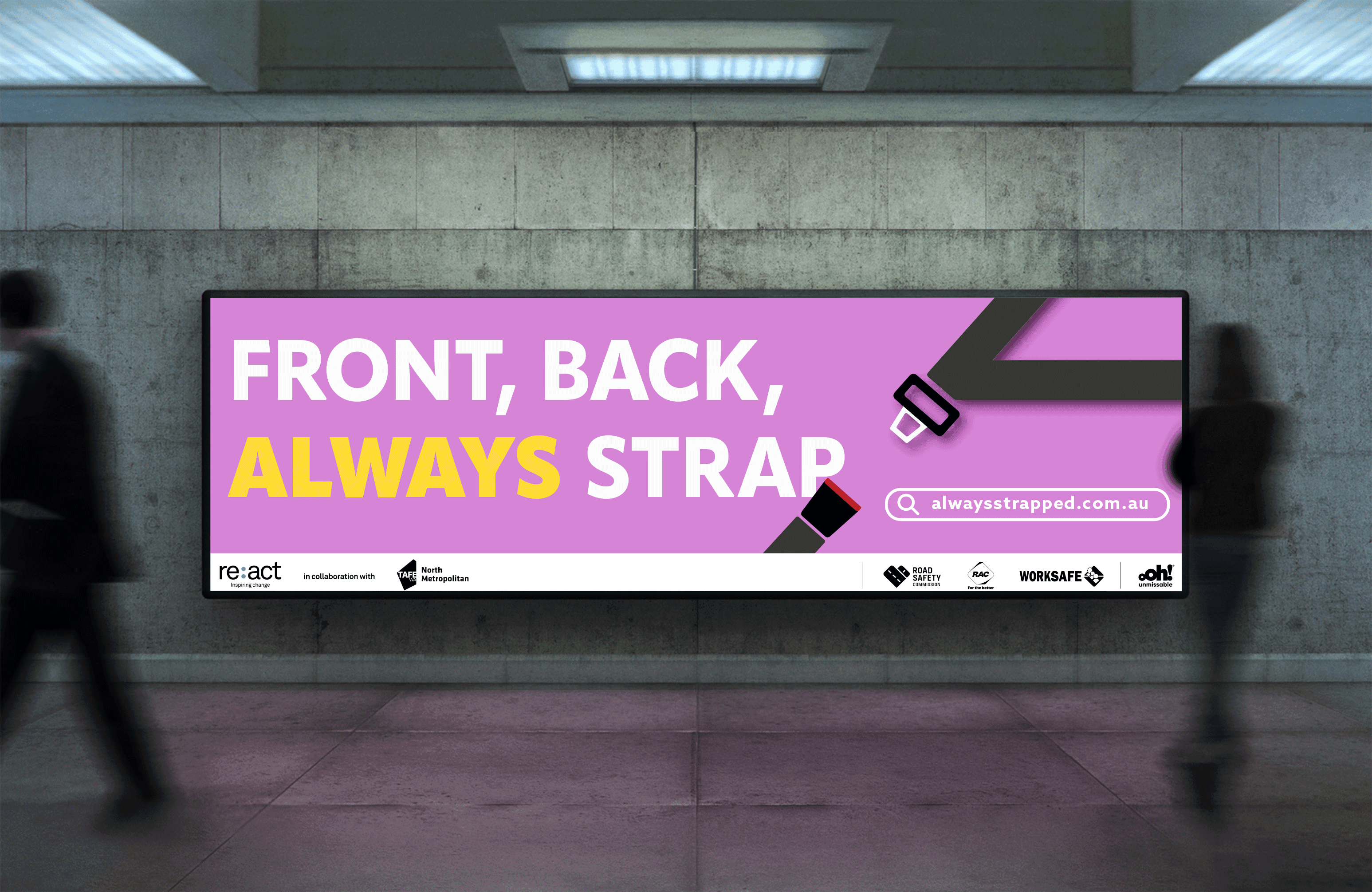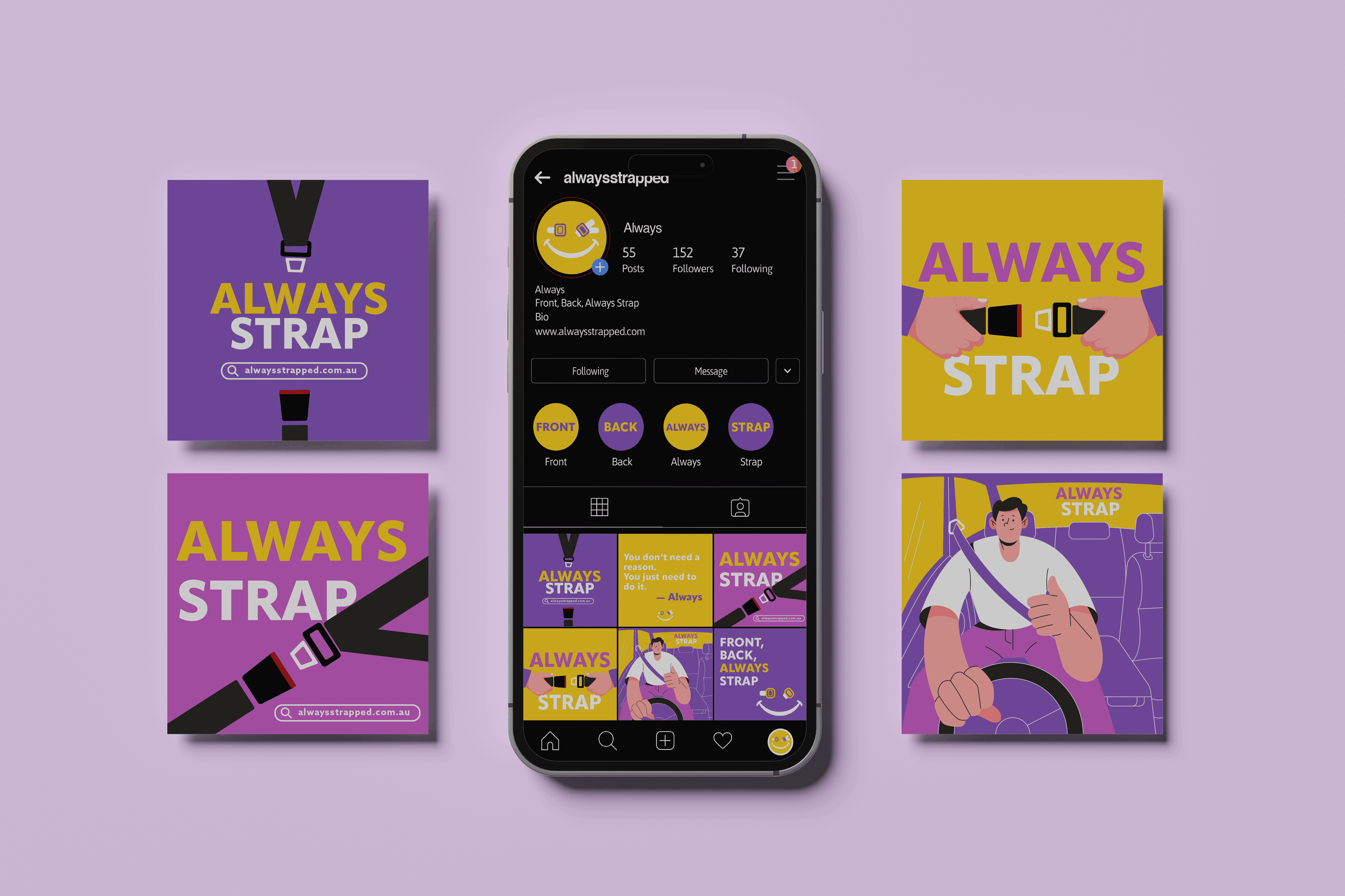 Always is a positive road safety campaign designed for Re:act 2025, created to encourage young drivers and passengers to wear their seatbelts every time they travel. Instead of using fear-based messaging, the campaign reframes seatbelts as a simple act of self-care. The tagline “Front. Back. Always. Strap.” pairs with bold typography, minimal graphics, and a high-contrast purple-and-yellow palette to build instant recognition across billboards, social media, and digital placements. The visual language is confident, clear, and memorable, using repetition and friendly cues to help turn seatbelt use into a daily habit.