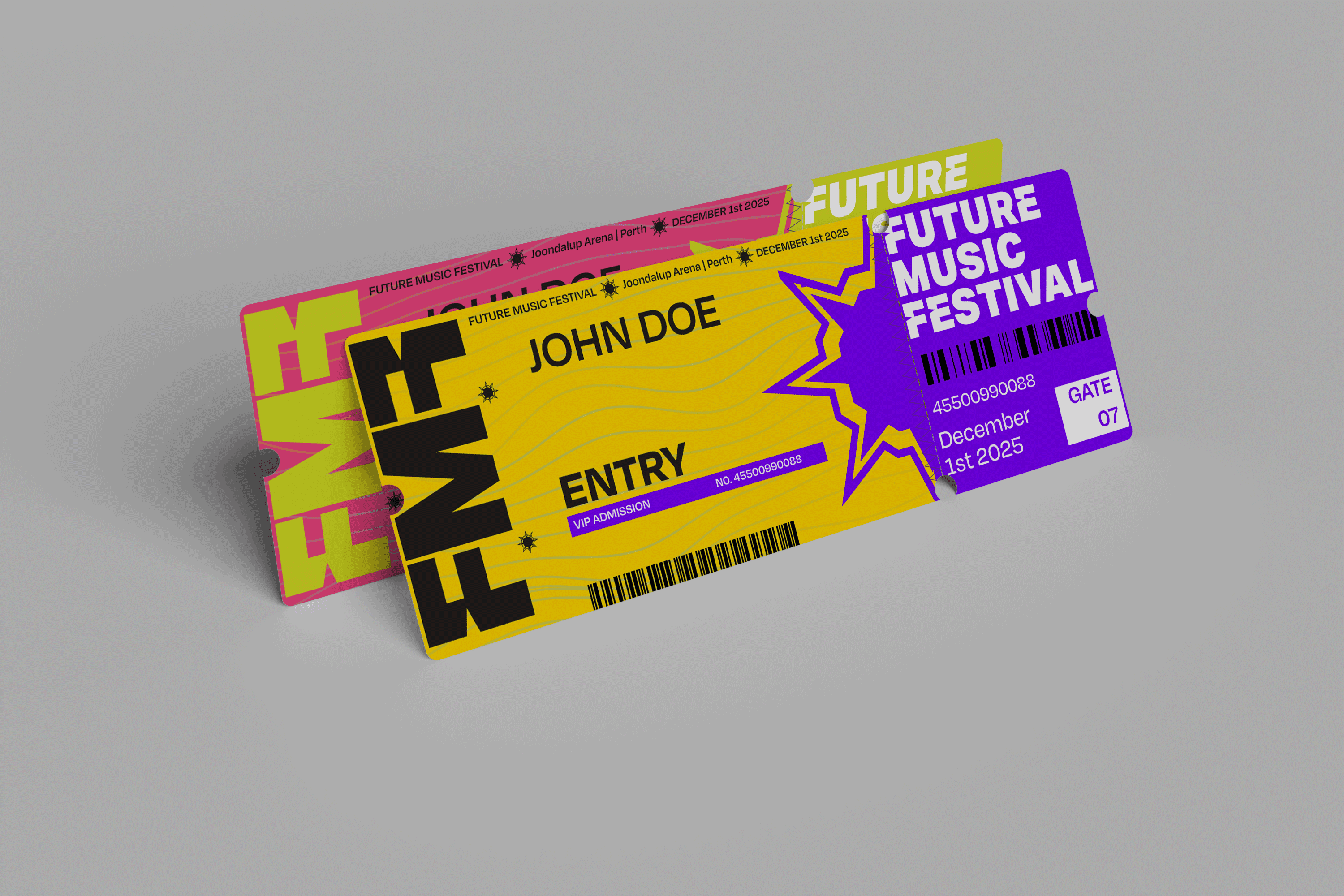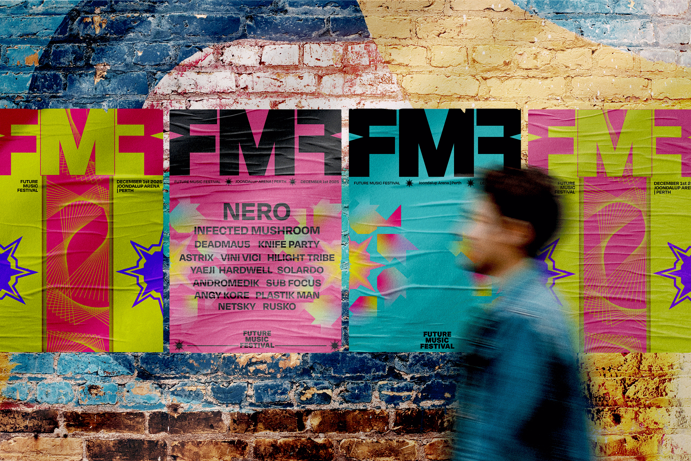 I re-imagined the discontinued Future Music Festival as a modern celebration of sound, light, and connection. The new identity uses bold gradients, modular typography, and fluid motion elements that capture the energy and sensory atmosphere of live music culture. Inspired by rhythm and light projection, the brand system extends across posters, merchandise, tickets, and digital rollouts, creating a unified and immersive festival experience.